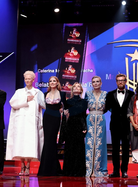 Tilda Swinton, Jessica Chastain, Isabelle Huppert, Mélita Toscan du Plantier, Simon Baker à la soirée d'anniversaire pour les 20 ans du Festival International du Film de Marrakech, Maroc, le 25 novembre 2023. © Dominique Jacovides/Bestimage Celebs attending the ceremony for the 20th annual Marrakech International Film Festival on November 25, 2023 in Marrakech, Morocco.