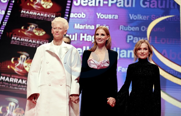 Tilda Swinton, Jessica Chastain, Isabelle Huppert à la soirée d'anniversaire pour les 20 ans du Festival International du Film de Marrakech, Maroc, le 25 novembre 2023. © Dominique Jacovides/Bestimage Celebs attending the ceremony for the 20th annual Marrakech International Film Festival on November 25, 2023 in Marrakech, Morocco.