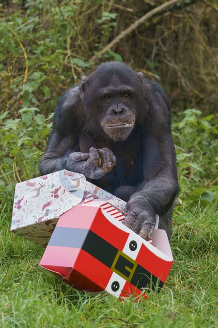 Endangered chimpanzee explores Christmas boxes at Whipsnade Zoo