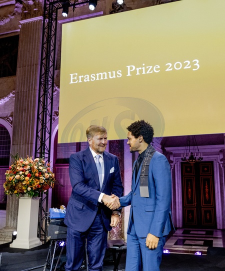 Le roi Willem-Alexander des Pays-Bas remet au comédien sud-africain Trevor Noah le prix Erasmus au palais royal à Amsterdam, en présence de La princesse Beatrix des Pays-Bas, le 28 novembre 2023. Le thème du prix de cette année est "Éloge de la folie". "En tant qu'humoriste, animateur de télévision, commentateur politique, philanthrope et auteur, Trevor Noah a pris avec confiance sa place au centre de la satire politique contemporaine. Dans son autobiographie « Born a Crime », Noah décrit comment, en tant qu'enfant d'une mère noire Xhosa et d'un père blanc suisse pendant l'apartheid, il a été confronté très tôt au racisme et à la violence institutionnels. A partir de cette expérience, il affronte l'injustice et nous montre son absurdité; non pas avec cynisme, mais avec le pouvoir libérateur du rire", indique le rapport du jury. Selon ce dernier, il a été un souffle d'air frais dans un paysage médiatique férocement polarisé. Le prix Erasmus est décerné chaque année à une personne ou une institution qui a apporté une contribution importante aux sciences humaines, sociales et artistiques dans le cadre des traditions culturelles européennes. Le prix Erasmus est doté de la somme de 150.000 euros. Au cours de ses 65 années d'existence, le prix avait été décerné à un autre humoriste en la personne de C.Chaplin des mains du prince Bernhard en 1965. King Willem-Alexander will presented the Erasmus Prize to the South African comedian Trevor Noah (Johannesburg, 1984) in the Royal Palace Amsterdam. The King is Regent of the Praemium Erasmianum Foundation. The theme of this year's prize is 'Praise of Folly'. Princess Beatrix will also be present at the ceremony. The jury awards Noah the prize for his inspired contribution to the theme area 'Praise of Folly,' named after Erasmus' book that focuses on humor, social criticism and political satire. With his talent for mocking, linguistic and connecting political humor, Noah acts 'in an Erasmian spirit,' according to the jury. "As a humorist, television host, political commentator, philanthropist and author, Trevor Noah has confidently taken his place at the focal point of contemporary political satire. In his autobiography 'Born a Crime', Noah describes how, as the child of a black Xhosa mother and a white Swiss father during Apartheid, he was confronted with institutional racism and violence early in his life. From that experience he confronts injustice and shows us its absurdity; not with cynicism, but with the liberating power of laughter,” said the jury report. With his reflections on issues such as the rise of 'fake news', the presidency of D.Trump, the Covid-19 pandemic and Black Lives Matter, he attracted a young, diverse audience worldwide and, according to the jury, he was a breath of fresh air in a fierce polarized media landscape. The Erasmus Prize is awarded annually to a person or institution that has made an important contribution to the humanities, social sciences and the arts within the framework of Europe's cultural traditions. The Praemium Erasmianum Foundation focuses on a different theme every year. The prize consists of a cash prize of 150,000 euros. In its 65-year existence, a humorist has won the Erasmus Prize once before: Charlie Chaplin received the prize from Prince Bernhard in 1965.