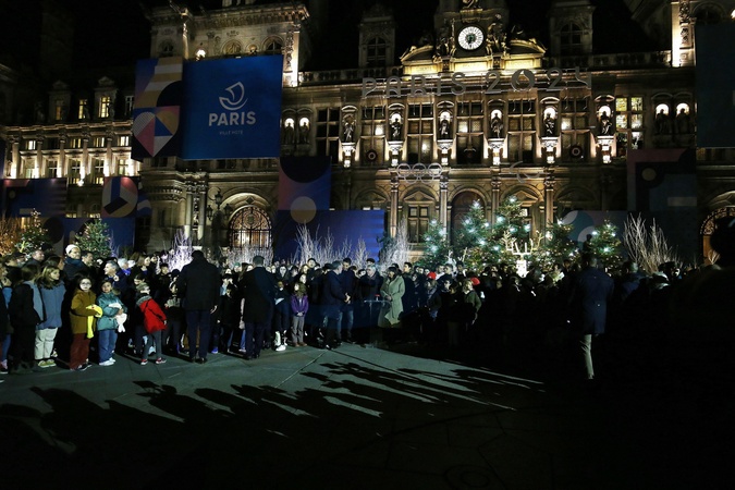 Illustrations de la mairie de Paris décorée aux couleurs des Jeux Olympiques Paris24. Paris, le 28 novembre 2023. Illustrations of the Paris town hall decorated in the colors of the Paris24 Olympic Games. Paris, November 28, 2023.