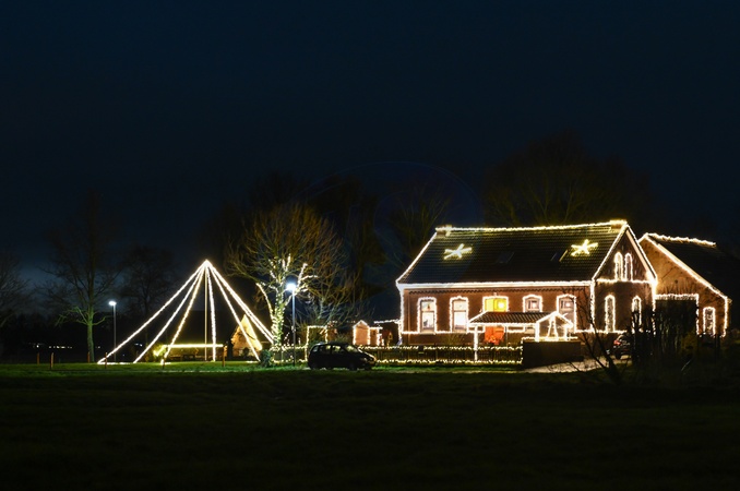 PRODUCTION - 28 November 2023, Lower Saxony, Bingumgaste: A house in the village of Bingumgaste is decorated and illuminated for Christmas. With the start of the Advent season, the East Frisian village is transformed into a Christmas village every year. Many of the 20 houses in the village are then decorated with long strings of lights., Credit:Lars Penning / Avalon