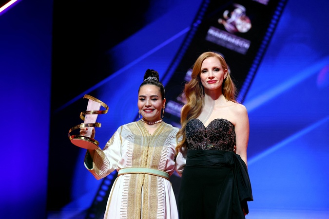 Asmae El Moudir reçoit L'Etoile d'Or pour son film "La mère de tous les mensonges", Jessica Chastain lors de la cérémonie de clôture et de la remise des prix du 20ème Festival International du Film de Marrakech, Maroc, le 2 décembre 2023. © Dominique Jacovides/Bestimage Celebs attend the closing ceremony during the 20th Marrakech International Film Festival in Marrakech, Morocco, on December 2nd, 2023.