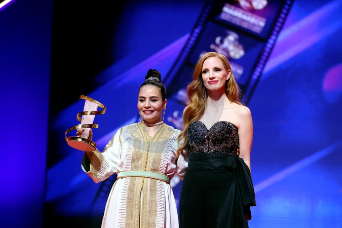 Asmae El Moudir reçoit L'Etoile d'Or pour son film "La mère de tous les mensonges", Jessica Chastain lors de la cérémonie de clôture et de la remise des prix du 20ème Festival International du Film de Marrakech, Maroc, le 2 décembre 2023. © Dominique Jacovides/Bestimage Celebs attend the closing ceremony during the 20th Marrakech International Film Festival in Marrakech, Morocco, on December 2nd, 2023.