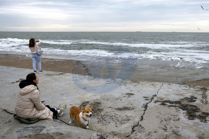ODESA, UKRAINE - DECEMBER 3, 2023 - A woman with a Corgi face the Black Sea in winter, Odesa, southern Ukraine., Credit:MARKIIAN LYSEIKO / Avalon