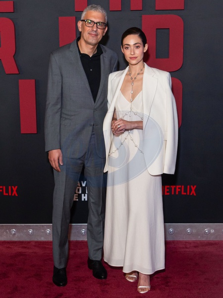 MANHATTAN, NEW YORK CITY, NEW YORK, USA - DECEMBER 04: American film and television producer, director and screenwriter Sam Esmail and wife/American actress, director and singer Emmy Rossum arrive at the New York Premiere Of Netflix's 'Leave The World Behind' held at The Paris Theater on December 4, 2023 in Manhattan, New York City, New York, United States., Credit:Christian Lora / Avalon