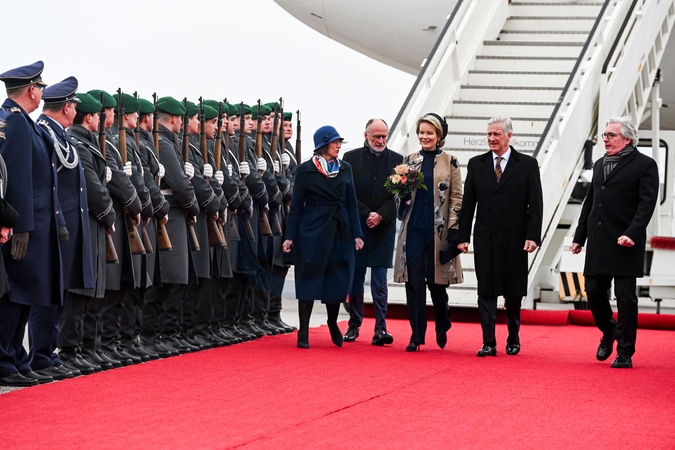 Le roi Philippe et la reine Mathilde de Belgique lors de leur visite officielle en Allemagne, le 5 décembre 2023. © Frédéric Andrieu/Bestimage Her Majesty The King Philippe and the Queen Mathilde take part of the State visit in Federal Republic of Germany for three days. Arrival of TTMM the King and the Queen of the Belgians, the Ministers, the official, business, academic and press delegations at Berlin Brandenburg Airport, Military Section Welcome by State Secretary Dr. Dörte Dinger, Head of the Office of the Federal President, Mr. Volker Timmermann, German Deputy Chief of Protocol and HE Geert Muylle, Ambassador of Belgium in Germany Ceremony on red carpet. © F.Andrieu / Agencepeps