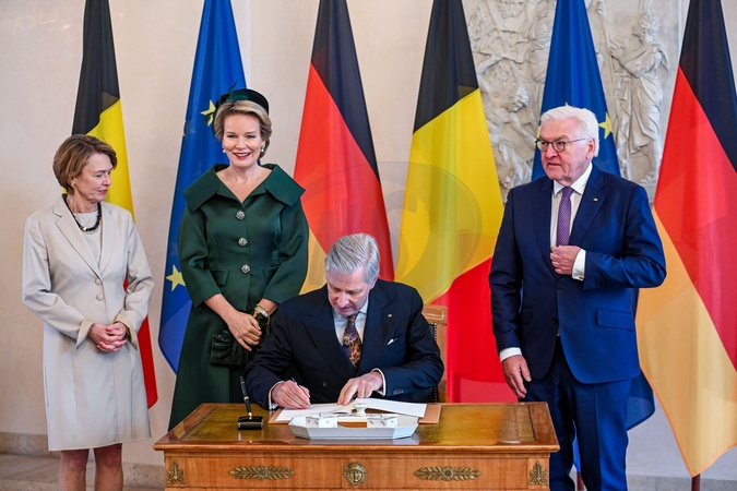 Le roi Philippe et la reine Mathilde de Belgique lors de leur visite officielle en Allemagne, le 5 décembre 2023. © Frédéric Andrieu/Bestimage Her Majesty The King Philippe and the Queen Mathilde take part of the State visit in Federal Republic of Germany for three days. Welcome Ceremony by HE Frank-Walter Steinmeier, President of the Federal Republic of Germany and Mrs. Elke Büdenbender, the First Lady Welcome by President Steinmeier and the First Lady Inspection of the troops by President Steinmeier and HM the King Short encounter with German school children for Their Majesties Presentation of the German and Belgian delegations Signing of the Visitor Book for Their Majesties © F.Andrieu / Agencepeps