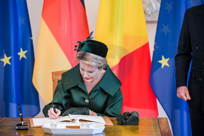 Le roi Philippe et la reine Mathilde de Belgique lors de leur visite officielle en Allemagne, le 5 décembre 2023. © Frédéric Andrieu/Bestimage Her Majesty The King Philippe and the Queen Mathilde take part of the State visit in Federal Republic of Germany for three days. Welcome Ceremony by HE Frank-Walter Steinmeier, President of the Federal Republic of Germany and Mrs. Elke Büdenbender, the First Lady Welcome by President Steinmeier and the First Lady Inspection of the troops by President Steinmeier and HM the King Short encounter with German school children for Their Majesties Presentation of the German and Belgian delegations Signing of the Visitor Book for Their Majesties © F.Andrieu / Agencepeps