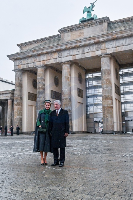 Le roi Philippe et la reine Mathilde de Belgique lors de leur visite officielle en Allemagne, le 5 décembre 2023. © Frédéric Andrieu/Bestimage Her Majesty The King Philippe and the Queen Mathilde take part of the State visit in Federal Republic of Germany for three days. Walk through the Brandenburger Tor with photo opportunity in presence of HE Kai Wegner, Governing Mayor of Berlin © F.Andrieu / Agencepeps