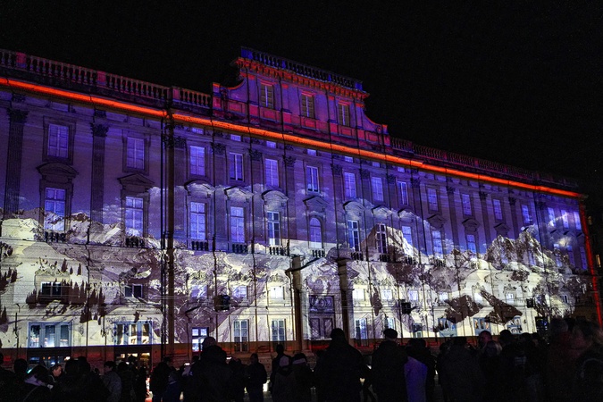 Cellulo/d (à prononcer "Celluloïd"), Bruno Ribeiro conjugue avec brio patrimoine et nouvelles technologies en nous offrant la métamorphose, en direct, de films légendaires réalisés par Louis et Auguste Lumière place des Terreaux - Illustrations de la Fête des Lumières à Lyon, France. Le 7 décembre 2023 © Sandrine Thesillat / Panoramic / Bestimage Illustrations of the Festival of Lights in Lyon. On December 7th 2023