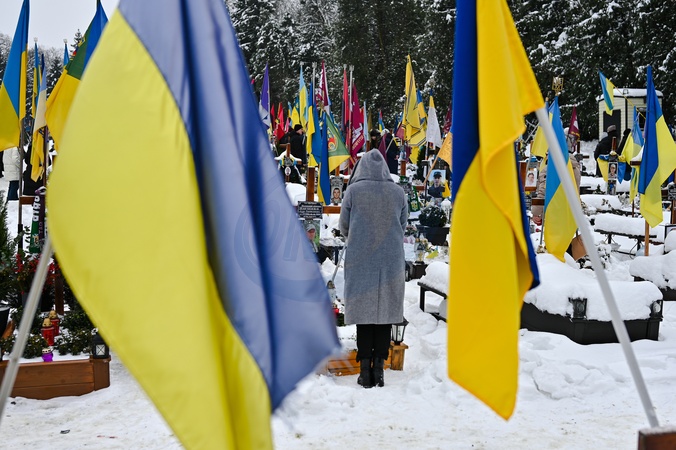 LVIV, UKRAINE - DECEMBER 6, 2023 - A woman stands before a grave at the Lychakiv Cemetery during a ceremony in remembrance of the heroes who perished in the fight for a free and independent Ukraine on the Day of the Armed Forces of Ukraine, Lviv, western Ukraine., Credit:Anastasia Smolienko / Avalon