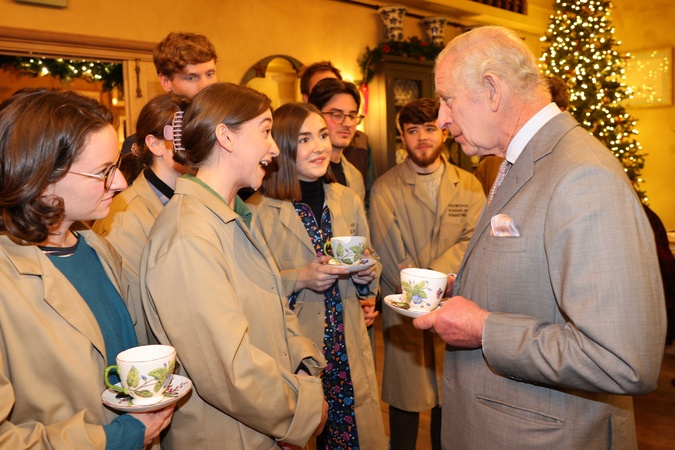 Britain's King Charles III (R) speaks to students from Snowdon School of Furniture during a festive themed 'Celebration of Craft' at Highgrove House in Tetbury, western England on December 8, 2023. The King met graduates and tutors and saw the work produced by The King's Foundation's Craft programmes, including the Metiers d'Art Fellowship, the School of Traditional Arts, and the Building Arts Programme., Credit:ADRIAN DENNIS / Avalon