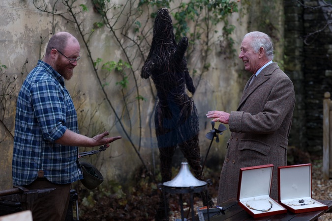 Britain's King Charles III (R) laughs with Ian Thackray (L), a blacksmith who realises his hands are too dirty to shake hands with the King, during a festive themed 'Celebration of Craft' at Highgrove House in Tetbury, western England on December 8, 2023. The King met graduates and tutors and saw the work produced by The King's Foundation's Craft programmes, including the Metiers d'Art Fellowship, the School of Traditional Arts, and the Building Arts Programme., Credit:ADRIAN DENNIS / Avalon