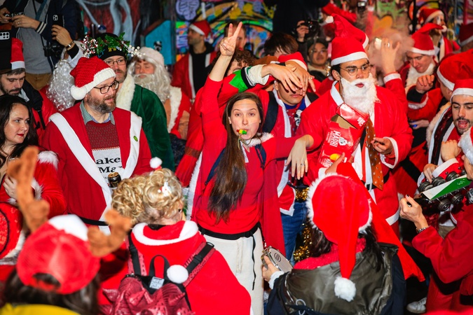 London, UK 09th Dec 2023. Santa revellers have fun at the start in Leake Street Tunnel. Hundreds of participants dressed in santa outfits have fun at the annual SantaCon London Christmas parade. The get together, which is non-profit and also collects for charitable causes, sees the cheerful santa revellers go on a walk starting at Leake Street in Waterloo, though parts of London and ending in Trafalgar Square in the evening, taking in various pub-stops and sights along the route., Credit:Imageplotter / Avalon