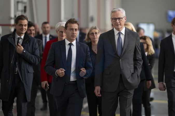 Le président Emmanuel Macron visite le site de Airbus à Toulouse à l'occasion des deux ans du plan d'investissement France 2030 le 11 décembre 2023. © Eliot Blondet / Pool / Bestimage CEO of Airbus Guillaume Faury speaks with French Economy Minister Bruno Le Maire during a french president visit to mark the two years of the France 2030 investment plan at the Airbus site in Toulouse, south-western France, on December 11, 2023.