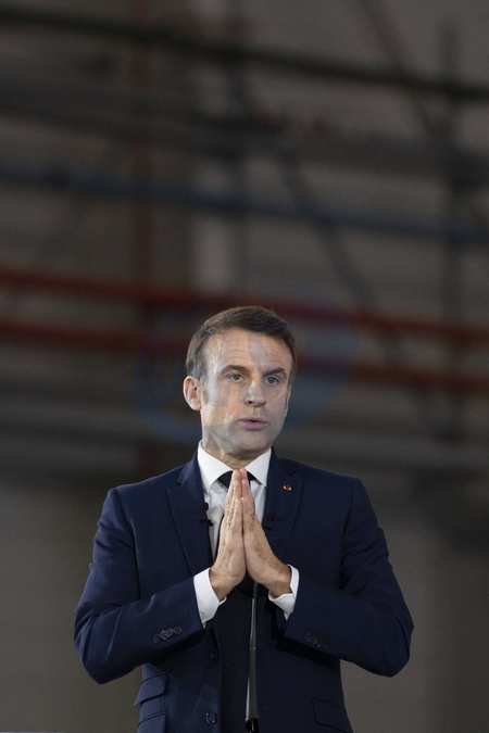 Le président Emmanuel Macron visite le site de Airbus à Toulouse à l'occasion des deux ans du plan d'investissement France 2030 le 11 décembre 2023. © Eliot Blondet / Pool / Bestimage French President Emmanuel Macron gestures as he addresses a speech during a visit to mark the two years of the France 2030 investment plan at the Airbus site in Toulouse, south-western France, on December 11, 2023.