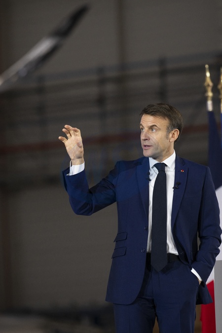 Le président Emmanuel Macron visite le site de Airbus à Toulouse à l'occasion des deux ans du plan d'investissement France 2030 le 11 décembre 2023. © Eliot Blondet / Pool / Bestimage French President Emmanuel Macron gestures as he addresses a speech during a visit to mark the two years of the France 2030 investment plan at the Airbus site in Toulouse, south-western France, on December 11, 2023.