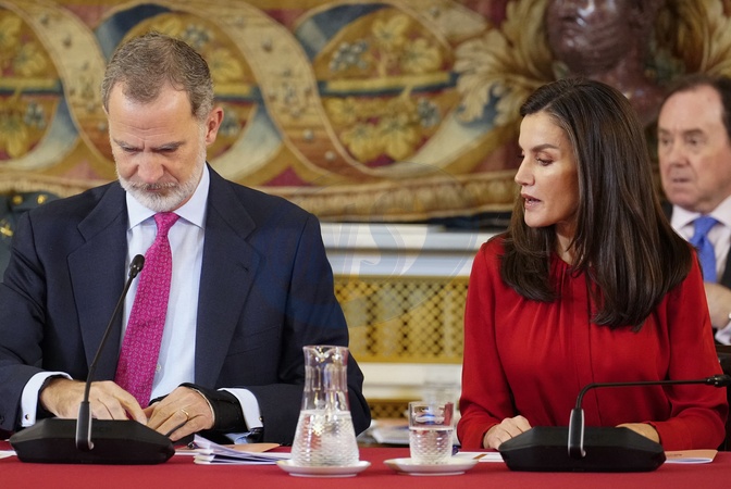 Król Felipe VI i królowa Letizia podczas spotkania zarządu Fundacji Księżnej Girony w Pałacu Królewskim w Madrycie