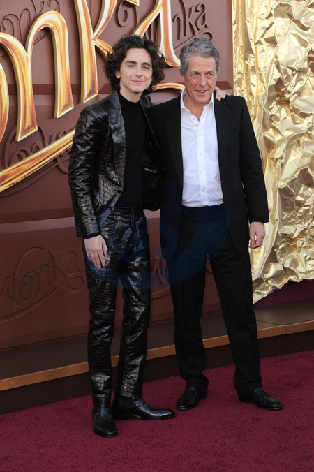 Timothee Chalamet and Hugh Grant at the Los Angeles premiere of 'Wonka' held at the Regency Village Theater in Westwood, USA on December 10, 2023., Credit:Lumeimages.com / Avalon