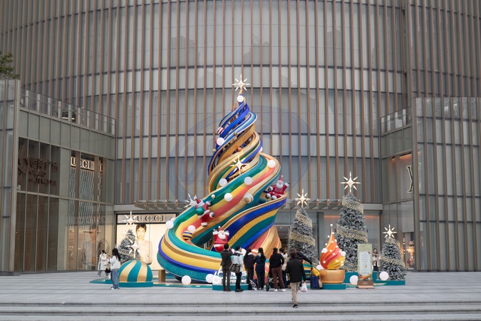 A view of a artistic Christmas Tree set up outside a high-end department store in Shanghai, China Wednesday, Dec. 13, 2023., Credit:WANG GANG / Avalon
