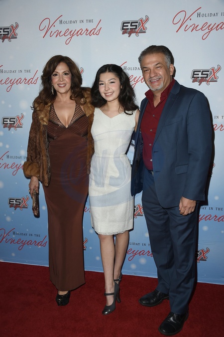 Maria Canals-Barrera, Bridget Barrera, David Barrera attends the Holidays in the Vineyards Premiere at SJR Theatre in Burbank, California on December 12, 2023, Credit:Avalon