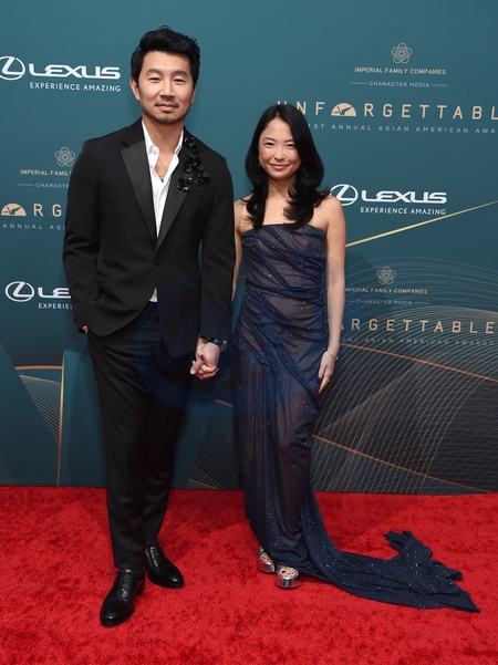 Simu Liu and Allison Hsu arriving to the Unforgettable: The 21st Annual Asian American Awards at Beverly Hilton Hotel on December 16, 2023 in Beverly Hills