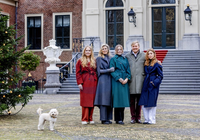 La reine Maxima et le roi Willem-Alexander des Pays-Bas avec la princesse Catharina-Amalia des Pays-Bas, la princesse Alexia des Pays-Bas et la princesse Ariane des Pays-Bas et le chien Mambo - La famille royale des Pays-Bas lors de la séance photographique hivernale au château Huis ten Bosch à La Haye, Pays-Bas, le 22 décemnre 2023. Christmas Photosession with King Willem-Alexander, Queen Maxima, Prinses Amalia, Princess Alexia and Princess Ariane and their dog Mambo.