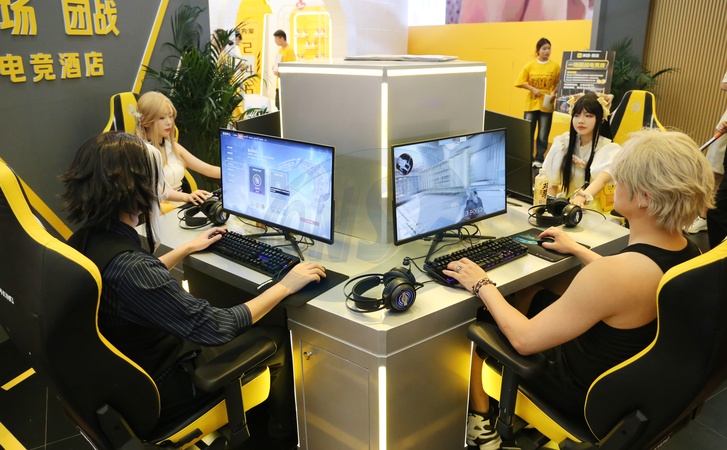 Four young people play an online game in a promotional event during ChinaJoy, an annual expo of Chinese digital entertainment, in Shanghai, China Sunday, July 30, 2023., Credit:YUYU CHEN / Avalon