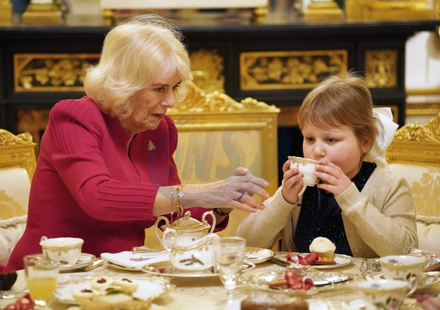 Queen Camilla offers seven-year-old Olivia Taylor from Sidcup her very first cup of tea during a visit to Windsor Castle, Berkshire. The blind schoolgirl with a brain tumour sang a Christmas song and gave the Queen a handmade ring when she was invited to Windsor Castle., Credit:Jonathan Brady / Avalon