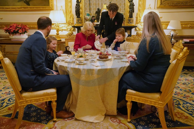 Queen Camilla takes tea with seven-year-old Olivia Taylor from Sidcup along with her sister Imogen, four, (second left), father Matt (left), and mother Lisa (right) at Windsor Castle, Berkshire. The blind schoolgirl with a brain tumour sang a Christmas song and gave the Queen a handmade ring when she was invited to Windsor Castle., Credit:Jonathan Brady / Avalon