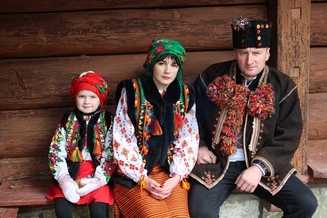 KRYVORIVNIA, UKRAINE - DECEMBER 25, 2023 - A man, woman and girl wear traditional Hutsul costumes in Kryvorivnia, Ivano-Frankivsk region, western Ukraine., Credit:Yurii Rylchuk / Avalon