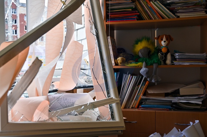 LVIV, UKRAINE - DECEMBER 29, 2023 - A book, a painting and some broken glass are seen on the floor of a lyceum damaged by a Russian missile attack, Lviv, western Ukraine, Credit:Anastasiia Smoliyenko / Avalon