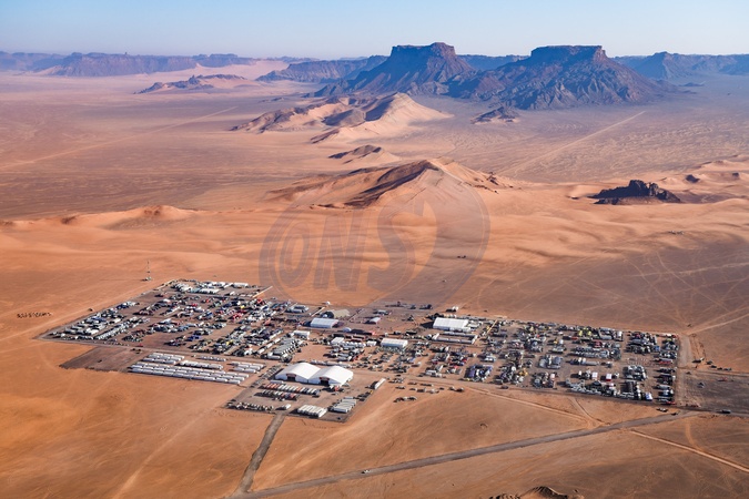 Vue aérienne du bivouac du Dakar 2024 lors des Vérifications administratives et techniques à Al-Ula en Arabie Saoudite