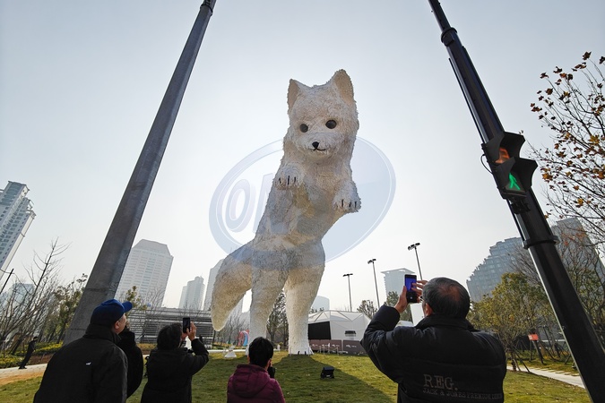 A view of the giant art installation named "Let's jump!" created by Holland artist Florentijn Hofman in Shanghai, China Thursday, Jan. 04, 2024. The installation depicting an Arctic fox delights with its glowing eyes and fluttering paper-like fur., Credit:WANG GANG / Avalon