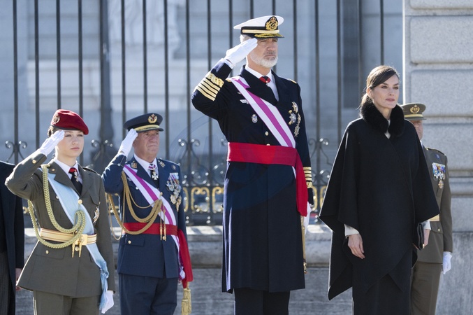 Król Felipe VI, królowa Hiszpanii Letizia i księżniczka Leonor biorą udział w ceremonii wojskowej „Pascua Militar” w Pałacu Królewskim w Madrycie