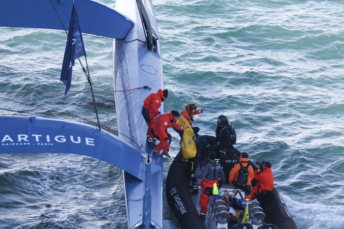François gabart quittant SVR-Lazartigue, en mer avant le départ offciel, ARKEA ULTIM CHALLENGE - Brest, le 07/01/24 . © Alexis Courcoux/Panoramic/Bestimage