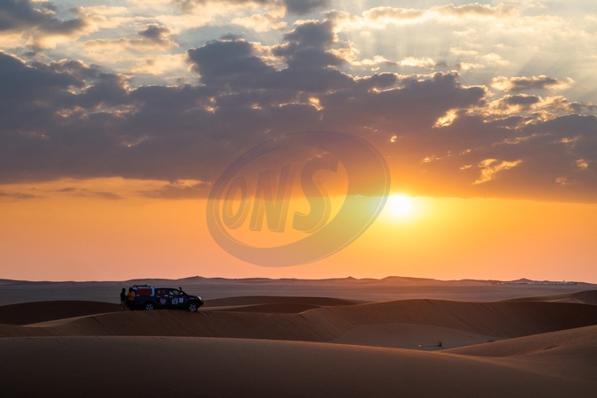 sunrise with an ASO organisation G3 car during the Stage 2 of the Dakar 2024 on January 7, 2024 between Al Henakiyah and Al Duwadimi, Saudi Arabia. © Florent Gooden/DPPI/Panoramic/Bestimage