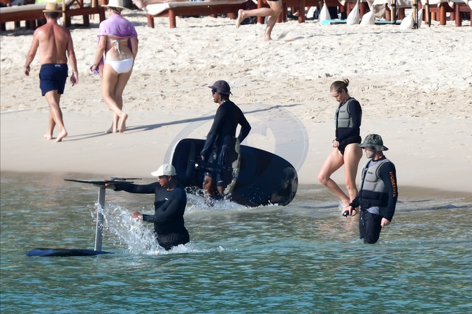 Exclusif - Prix spécial - No Web - Exclusif - Prix spécial - No Web - Jason Statham et sa compagne Rosie Huntington-Whiteley s'essaient à la planche volante ou foil électrique lors de leurs vacances à Phuket, Thaïlande le 2 janvier 2024. Exclusive - For Germany call for price - No web - Jason Statham and his partner Rosie Huntington-Whiteley try out an electric hoverboard or foil during their vacation in Phuket, Thailand on January 2, 2024.