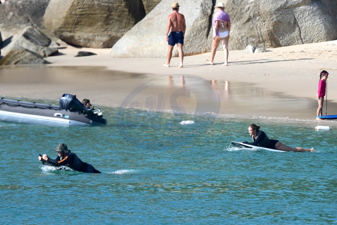 Exclusif - Prix spécial - No Web - Exclusif - Prix spécial - No Web - Jason Statham et sa compagne Rosie Huntington-Whiteley s'essaient à la planche volante ou foil électrique lors de leurs vacances à Phuket, Thaïlande le 2 janvier 2024. Exclusive - For Germany call for price - No web - Jason Statham and his partner Rosie Huntington-Whiteley try out an electric hoverboard or foil during their vacation in Phuket, Thailand on January 2, 2024.