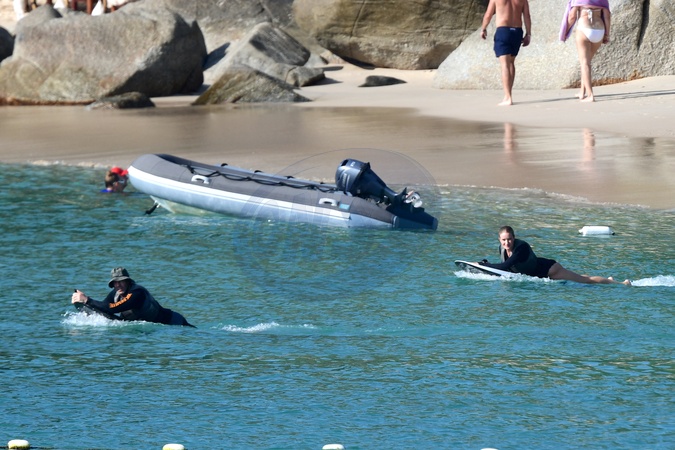 Exclusif - Prix spécial - No Web - Exclusif - Prix spécial - No Web - Jason Statham et sa compagne Rosie Huntington-Whiteley s'essaient à la planche volante ou foil électrique lors de leurs vacances à Phuket, Thaïlande le 2 janvier 2024. Exclusive - For Germany call for price - No web - Jason Statham and his partner Rosie Huntington-Whiteley try out an electric hoverboard or foil during their vacation in Phuket, Thailand on January 2, 2024.