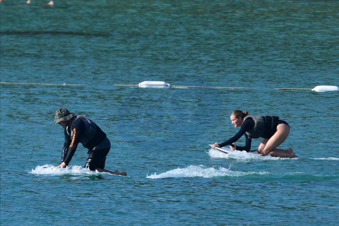 Exclusif - Prix spécial - No Web - Exclusif - Prix spécial - No Web - Jason Statham et sa compagne Rosie Huntington-Whiteley s'essaient à la planche volante ou foil électrique lors de leurs vacances à Phuket, Thaïlande le 2 janvier 2024. Exclusive - For Germany call for price - No web - Jason Statham and his partner Rosie Huntington-Whiteley try out an electric hoverboard or foil during their vacation in Phuket, Thailand on January 2, 2024.
