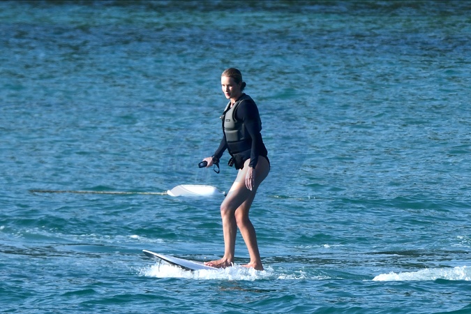 Exclusif - Prix spécial - No Web - Exclusif - Prix spécial - No Web - Jason Statham et sa compagne Rosie Huntington-Whiteley s'essaient à la planche volante ou foil électrique lors de leurs vacances à Phuket, Thaïlande le 2 janvier 2024. Exclusive - For Germany call for price - No web - Jason Statham and his partner Rosie Huntington-Whiteley try out an electric hoverboard or foil during their vacation in Phuket, Thailand on January 2, 2024.