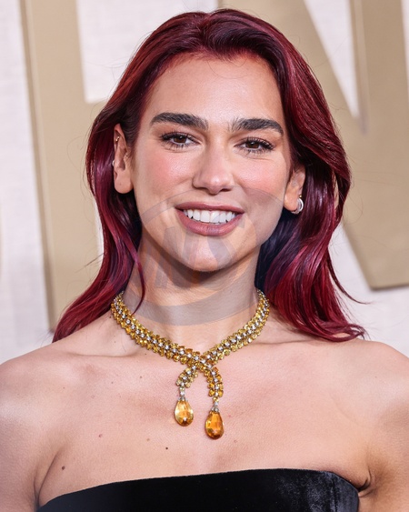 BEVERLY HILLS, LOS ANGELES, CALIFORNIA, USA - JANUARY 07: Dua Lipa wearing a custom Schiaparelli dress, Jimmy Choo shoes, and Tiffany and Co. jewelry arrives at the 81st Annual Golden Globe Awards held at The Beverly Hilton Hotel on January 7, 2024 in Beverly Hills, Los Angeles, California, United States., Credit:Xavier Collin / Avalon