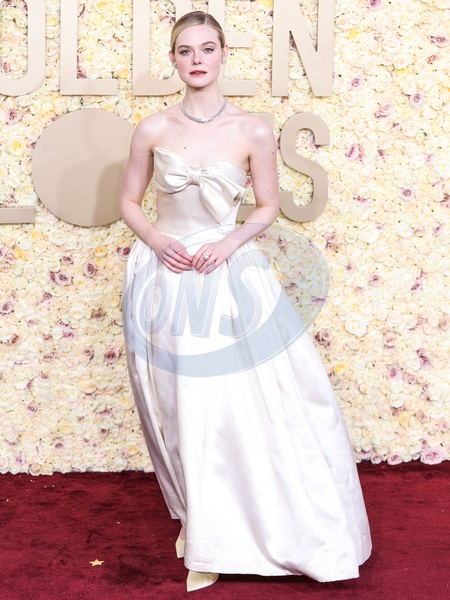 BEVERLY HILLS, LOS ANGELES, CALIFORNIA, USA - JANUARY 07: Elle Fanning wearing a vintage/archival Pierre Balmain couture gown from 1960, Jimmy Choo shoes, and Cartier jewelry arrives at the 81st Annual Golden Globe Awards held at The Beverly Hilton Hotel on January 7, 2024 in Beverly Hills, Los Angeles, California, United States., Credit:Xavier Collin / Avalon