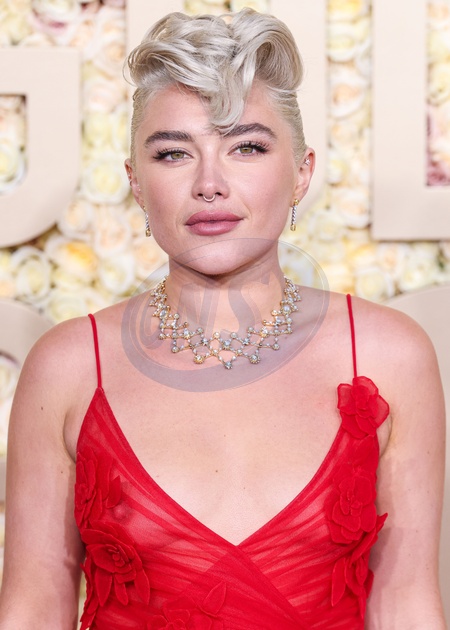 BEVERLY HILLS, LOS ANGELES, CALIFORNIA, USA - JANUARY 07: Florence Pugh wearing a Valentino look and Tiffany and Co. jewelry arrives at the 81st Annual Golden Globe Awards held at The Beverly Hilton Hotel on January 7, 2024 in Beverly Hills, Los Angeles, California, United States., Credit:Xavier Collin / Avalon
