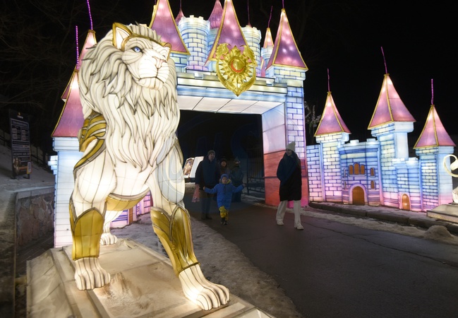 KYIV, UKRAINE - JANUARY 06, 2024 - A castle with lions illuminated installation presented during the festival "Lights & Dreams. Secrets of the Lanterns" at the Spivoche Pole festival grounds, Kyiv, capital of Ukraine., Credit:Ruslan Kanuka / Avalon