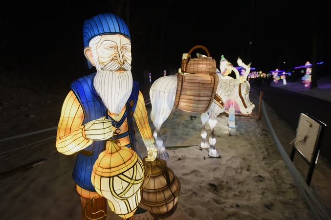 KYIV, UKRAINE - JANUARY 06, 2024 - A dwarf and deer illuminated installation presented during the festival "Lights & Dreams. Secrets of the Lanterns" at the Spivoche Pole festival grounds, Kyiv, capital of Ukraine., Credit:Ruslan Kanuka / Avalon