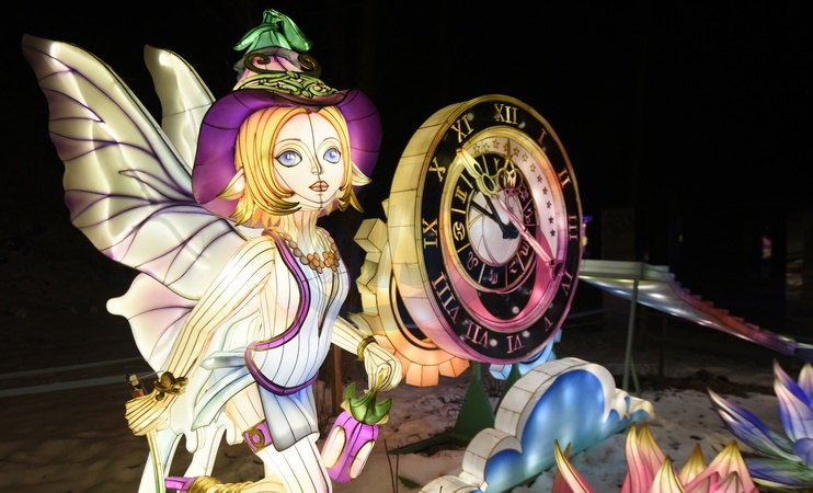 KYIV, UKRAINE - JANUARY 06, 2024 - A clock and fairy illuminated installation presented during the festival "Lights & Dreams. Secrets of the Lanterns" at the Spivoche Pole festival grounds, Kyiv, capital of Ukraine., Credit:Ruslan Kanuka / Avalon