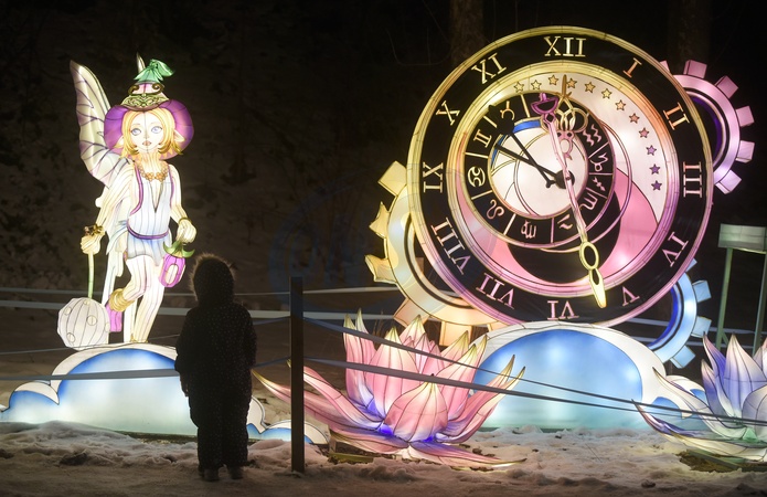 KYIV, UKRAINE - JANUARY 06, 2024 - A clock and fairy illuminated installation presented during the festival "Lights & Dreams. Secrets of the Lanterns" at the Spivoche Pole festival grounds, Kyiv, capital of Ukraine., Credit:Ruslan Kanuka / Avalon